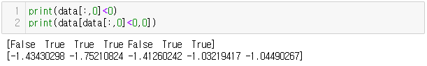 data[:,0]<0 # 1열에서 음수인 값은 True인 7 X 1의 mask 생성
