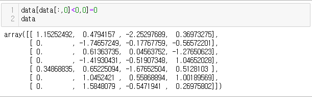 data[data[:,0]<0,0]=0 # 1열에서 0보다 작은 원소를 0으로 치환