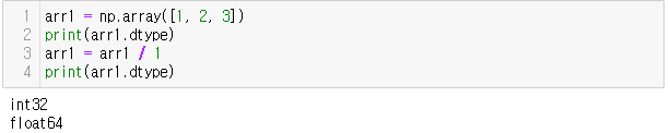print("arr2의 dtype : ", arr2.dtype) # arr2의 원소의 타입. int64 : integer + 64bits