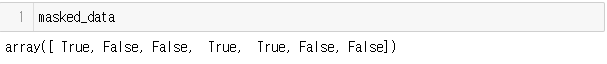 masked_data = (mask == 1) # boolean arry (boolean mask) :True False로 이루어진 것
