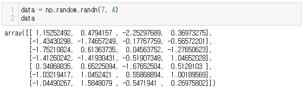 data = np.random.randn(7, 4) # 표준정규분포에서 random sampling을 한 원소를 가지는 7x4 행렬을 만든다.
