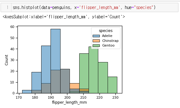 # penguin 데이터에 histplot을 출력합니다. 구간별 정보를 보고 싶을 때 사용