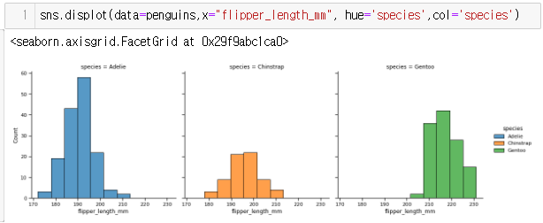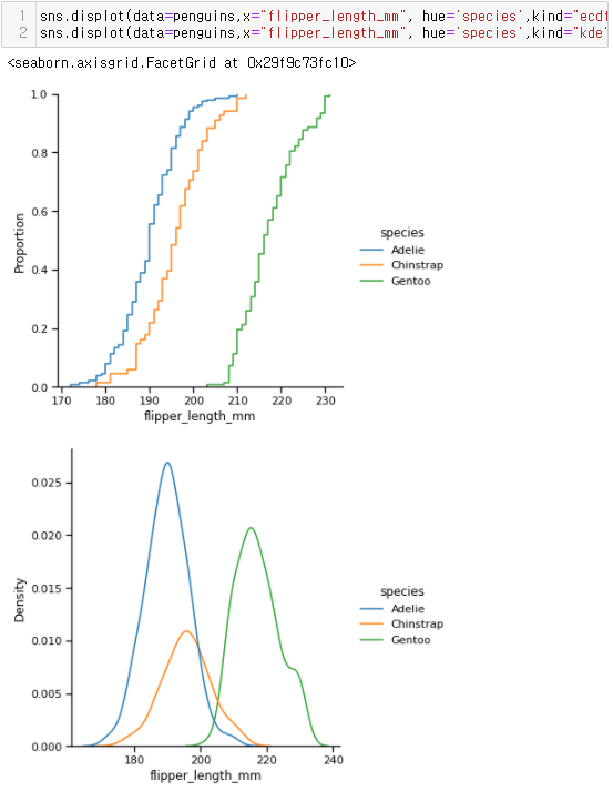 - displot에 kind를 변경하는 것으로, histplot, kde, ecdf 모두 출력이 가능합니다. e.g. displot(kind="hist")