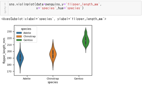 - 보통 boxplot과 함께 표시하면, 평균 근처에 데이터가 얼마나 있는지(boxplot) 전체적으로 어떻게 퍼져있는지(violinplot) 모두 확인이 가능합니다.