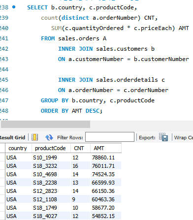 GROUP BY b.country, c.productCode