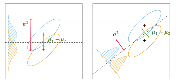 ※ LDA 결과 얻게 되는 decision boundary의 특징 : 평균의 차이는 최대화, 두 분포의 각각의 분산은 최소화