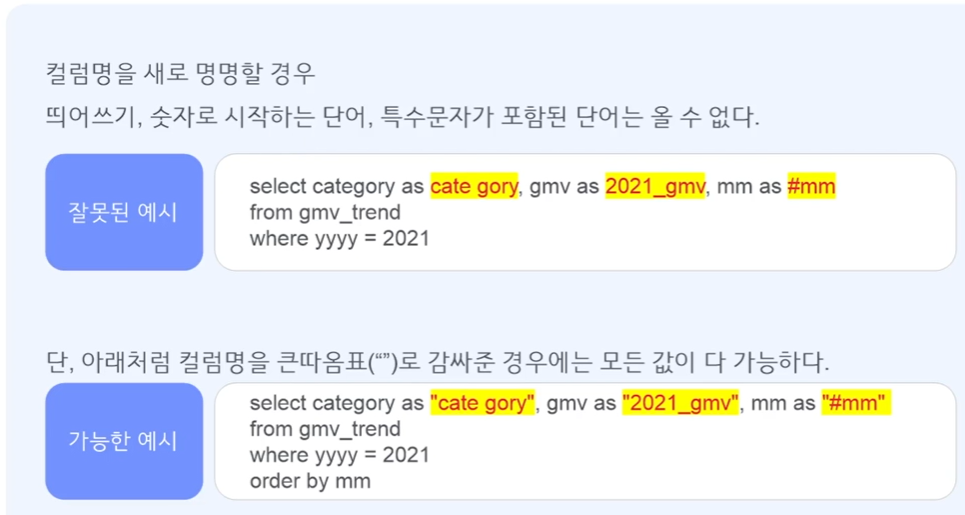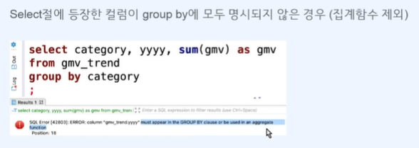 ※ GROUP BY 절에는 반드시 칼럼명이 사용되어야 하며 칼럼 Alias는 사용하면 안된다.