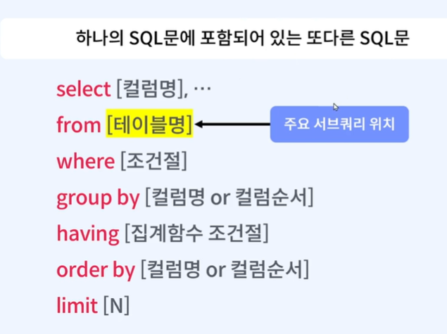 - 하나의 SQL문으로 풀 수 없는, 조금 더 복잡한 데이터를 추출할 때 서브쿼리 사용